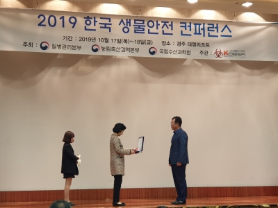 [충청뉴스큐] 대전시 보건환경연구원이 2019년도 ‘생물안전관리’유공 기관으로 선정돼 지난 17일부터 18일까지 경북 경주에서 열린 ‘2019년 한국 생물안전 컨퍼런스’에서 질병관리본부장 표창을 수상했다.