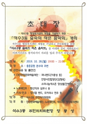 양동성 석수3동주민자치위원장은 “금년 처음 실시하는 ‘석수3동 숲속의 작은 음악회’에 주민들의 많은 관람을 바란다며 참석을 권했다.