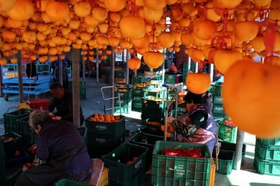 가을의 중턱 한낮에도 찬기운이 남아있지만 깎아진 감을 모아, 감타래에 걸는 인부들의 바쁜 손놀림으로 작업장은 어느새 열기로 가득찬다.