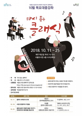 [충청뉴스큐] 서울도서관은 오는 10월 11일∼25일 매주 목요일, 서울도서관 사서교육장에서〈10월 목요대중강좌〉'다시 듣는 클래식'을 운영한다고 밝혔다.
