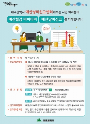 [충청뉴스큐] 대구시는 예산의 효율적 집행을 위한 시민참여를 확대하기 위해 오는 11월 한 달간 예산 절감제안 및 낭비신고 집중 제안기간을 운영한다.