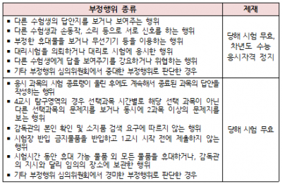 4교시 탐구영역에서 시간별로 해당 선택과목이 아닌 다른 과목 문제지를 보거나 동시에 2과목 이상의 문제지를 보는 경우, 탐구 영역 1개 과목 선택 수험생이 대기시간 동안 자습 등 일체의 시험 준비 또는 답안지 마킹행위를 하는 경우 부정행위로 간주된다.