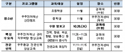 교육 프로그램은 청소년을 위한 ‘우주전파재난 안전캠프’, 핵심수요자를 위한 ‘우주전파재난 관리 직무역량 향상교육’ 및 우주환경 전문 교육 희망자를 위한 ‘우주환경 전문인력 양성교육’으로 구성되어 있다.