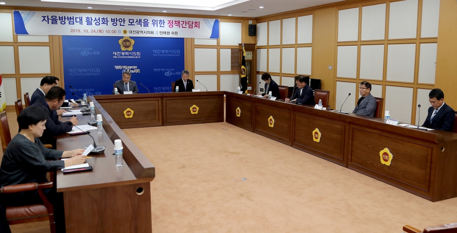 대전광역시의회는 24일, 민태권 의원(더불어민주당, 유성구 1) 주관으로 「자율방범대 활성화 방안 모색을 위한 정책간담회」를 개최했다. 이번 간담회는 자율방범대의 방범활동 환경 개선 등을 통하여 ‘범죄 예방 및 선도’활동을 활성화하기 위한 방안을 찾고자 마련됐다. 간담회는 대전시 민생사법경찰과장, 대전지방경찰청 생활안전계장, 대전시 자율방범연합회장, 각 구 자율방범연합대장이 참여하여 방범초소의 개선 필요성, 방범장비의 점검, 체계적인 방범활동을 위한 교육․훈련 필요성, 민․관이 함께하는 홍보의 필요성, 봉사활동에 대한 자긍심을 고취시키기 위한 방안 등 현장에서 느끼는 문제점 및 개선방안에 대하여 의견을 나누는 토론의 장이 됐다. 민 의원은 “현재 우리시에는 2,700 여명의 대원들이 활동하고 있지만, 봉사단체라는 이유로 방범초소 환경은 매우 열악하다며, 최근 자율방범대의 활동이 침체되고 있는 상황에서 이번 간담회를 계기로 다시 활성화될 수 있기를 바란다”며 “자율방범대원들의 사기진작을 통하여 참여를 독려하고, 대전시, 경찰청, 연합회․연합대가 협력관계를 통하여 체계적인 사회안전망을 구축할 수 있도록 의회에서도 적극 노력해 나가겠다”고 약속했다.
