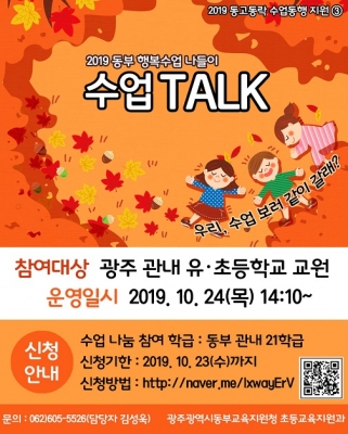 동부교육청은 초등학교 현장의 수업나눔 지원과 확산을 위해 1박2일 수업여행 ‘밤샘 TALK’, 동학년과 함께하는 교육과정 나눔 ‘동학년 TALK’ 등 다양한 사업을 운영해 나가고 있다.