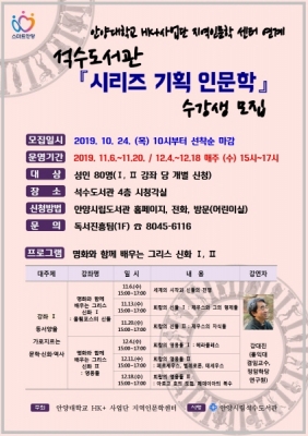 안양대학교 인문한국 플러스 사업단 지역인문학센터 주최로 열리는 이번 강좌는 11월 6일부터 12월 20일까지 석수도서관 4층 시청각실에서 진행된다.