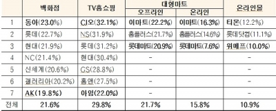 TV홈쇼핑, 대형마트, 백화점, 대형마트, 온라인몰 등의 순서로 납품업체가 부담하는 판매수수료 수준이 높은 것으로 나타났다.