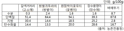 5종의 식용곤충은 고소애, 쌍별이, 꽃벵이, 장수애, 벼메뚜기 등이다.