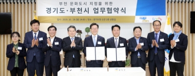 이재명 경기도지사와 장덕천 부천시장은 28일 경기도청에서 김경협 국회의원, 염종현 경기도의회 더불어민주당 대표, 임성환 문화체육관광위원, 손경년 부천문화재단대표이사 등이 참석한 가운데 이 같은 내용을 담은 ‘부천문화도시 지정을 위한 경기도, 부천시 업무협약서’에 공동서명했다.
