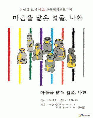 [충청뉴스큐] 부산시 시립박물관은 오는 11월 1일부터 16일까지 매주 금요일 오후 7시와 토요일 오후 6시 30분에 초·중학생을 동반한 가족을 대상으로 전시 연계 체험프로그램 ‘마음을 닮은 얼굴, 나한’을 운영한다고 밝혔다.