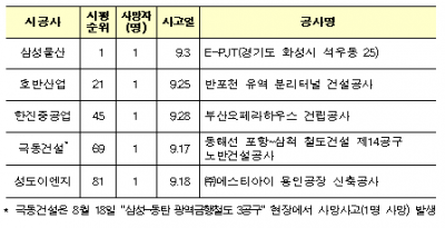 이 밖에 삼성물산, 호반산업, 한진중공업, 성도이엔지 현장에서도 각각 1명의 사고사망자가 발생하는 등 9월 한 달 동안 시공능력평가 상위 100위 중 5개 회사에서 5명의 사고사망자가 발생했다.