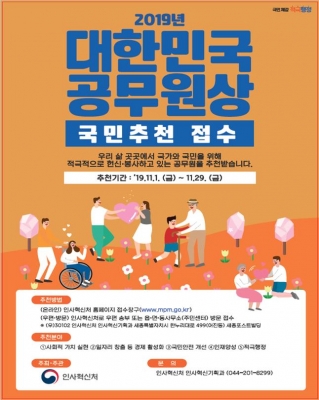인사혁신처는 국가와 국민을 위해 적극적으로 헌신·봉사하고 국가 주요 시책과제를 성공적으로 수행해 공직사회에 귀감이 되는 공무원을 선발·포상하기 위해 대한민국 공무원상 후보자 국민추천을 진행한다고 30일 밝혔다.