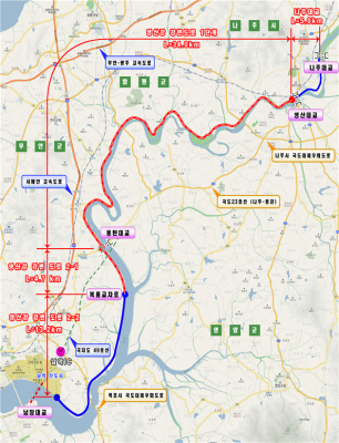 이에 따라 영산강 강변도로 1단계 사업으로 총길이 34㎞, 폭원 10m 규모 사업이 마무리 단계에 이르렀다. 교량 8개소와 터널 1개소를 포함하고 있다. 이 도로에선 영산강의 아름다운 곳 8경 가운데 6경인 몽탄 식영정, 다시 석관정, 나주평야, 죽산보 등 주변 경관을 조망할 수 있다.
