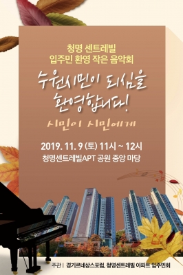 [충청뉴스큐] 지난 9월 수원시민이 된 청명센트레빌아파트 입주민을 환영하는 작은 음악회가 오는 9일 오전 11시 청명센트레빌아파트 공원 중앙 마당에서 열린다.