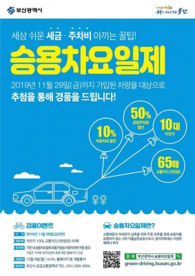 [충청뉴스큐] 부산시는 승용차요일제를 홍보하고 신규가입을 독려하기 위해 오는 29일까지 승용차요일제에 가입된 차량을 대상으로 경품이벤트를 실시한다고 밝혔다.