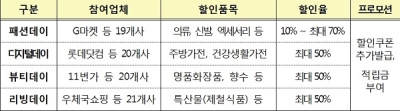 1일 지마켓·에이케이몰 등 19개 회사가 참여해 의류·신발·엑세서리 등 패션/잡화를 최대 70% 할인하여 판매하는 패션데이를 시작으로, 2일 에는 롯데닷컴·씨제이오쇼핑 등 20 회사가 참여하여 주방·생활가전 등 가전제품을 최대 50% 할인하여 판매하는 디지털데이가, 3일 에는 11번가·홈앤쇼핑 등 20개 회사가 참여하여 명품화장품·향수 등 화장품을 최대 50% 할인 판매하는 뷰티데이가 진행되며, 마지막인 10.4에는 우체국쇼핑·엔에스홈쇼핑 등 21개 회사가 참여해 생활용품·식품을 최대 50% 할인 판매하는 리빙데이를 진행한다.