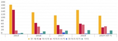 [충청뉴스큐] 해양수산부는 2019년도 3분기까지 전 세계 해역에서 지난해 동기보다 23.7% 감소한 119건의 해적 공격이 발생했다고 발표했다. 다만, 서부 아프리카의 해적 위협은 지속되고 있는 것으로 나타났다.