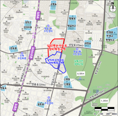 강동구 지하철 5호선 굽은다리역과 길동 자연생태공원 인근에 위치한 삼익파크아파트와 삼익맨숀아파트는 1980년대 중반 건설된 노후 아파트로 서로 경계면을 접하고 있는 지역적 특성을 살려 재건축 정비계획을 연계·조성했다. 자투리에 흩어져 있던 소공원을 하나의 문화공원으로 통합해 지상에는 해당 생활권에 부족한 문화시설을 확보하고 지하에는 길동 저층주거지 주차난 해소를 위한 공영주차장 281면 건립이 가능하도록 설계했다. 또한 공공보행로변에 휘트니스센터, 주민카페 등 주민공동이용시설을 집중 배치해 거주민의 이용 편의와 지역 개방성을 높였다.