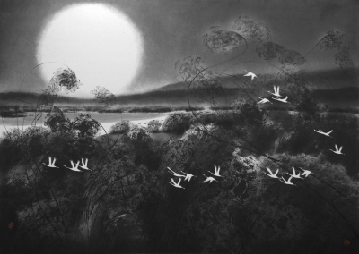 작품에 나타나는 흑두루미는 무병장수와 사랑의 인연을 강조하며 애틋한 사랑을 상징한다. 또한 갈대숲과 함께 어울려 숭고함을 넘어 고결한 서정성까지 강조시켜 만의 하늘에 꽃이 되고 시가 된다.