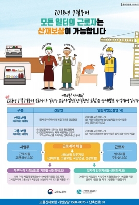 2018년 7월1일 부터 산재보험이 1인 이상 사업장에서 노동자를 고용하는 모든 사업장으로 확대됨에 따라 노동자는 언제, 어디서, 일하다 다쳐도 산재보상이 되고, 사업주는 노동자를 최초 고용한 날부터 14일 이내에 고용보험과 산재보험에 의무적으로 가입하여야 한다.