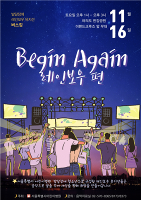[충청뉴스큐] 서울특별시 어린이병원은 발달장애 아동·청소년으로 구성된 ‘레인보우’뮤지션들의 버스킹 공연 ‘Begin Again’ 을 오는 16일 오후 1시 여의도 한강공원 이랜드크루즈 앞 무대에서 개최한다.
