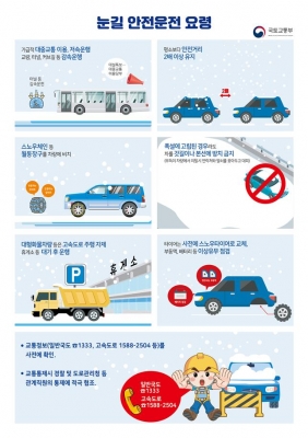 국토교통부 김용석 도로국장은 “강설 시에는 안전운행을 위해 ‘先제설 後통행’ 원칙에 따라 때때로 교통통제가 불가피하므로 국민들의 적극적인 참여와 협조가 절실하다”고 하면서 “눈길에는 가급적 대중교통을 이용해 주시고 ‘눈길 안전운전요령’을 숙지해 지켜 주시기 바란다”고 당부했다.