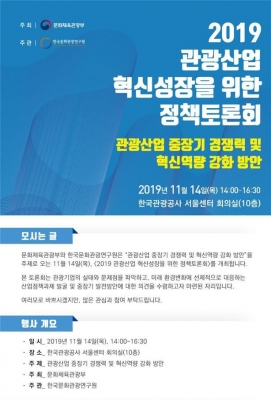 [충청뉴스큐] 문화체육관광부는 한국문화관광연구원과 함께 오는 14일 오후 2시 한국관광공사 서울센터 10층에서 ‘관광산업 혁신성장을 위한 정책토론회’를 개최한다.