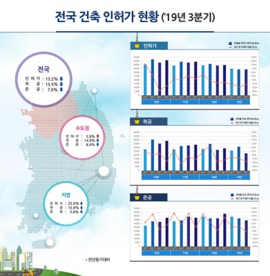 2019년 3분기 건축 인허가 면적은 전년 동기 대비 13.2% 감소한 3만3680천㎡, 동수는 13.5% 감소한 5만9159동이다. 수도권은 1만6437천㎡, 지방은 1만7243천㎡이다.