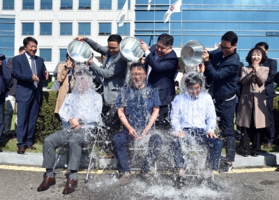 [충청뉴스큐] 경기도교육청 남부청사 현관 앞에서 2일 아침 ‘루게릭병 요양 병원 건립’을 위한 아이스버킷 챌린지가 진행됐다.