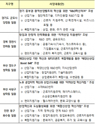 이번에 선정된 5곳은 LH가 토지를 확보하고 산업·상업·주거·문화 등의 기능이 복합된 앵커시설을 건립해 기업을 지원하고 해당 지역을 매력적인 공간으로 탈바꿈시킬 계획이라고 전했다.