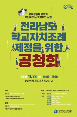 [충청뉴스큐] 전라남도 학교자치조례 제정을 추진 중인 전라남도교육청이 조례 제정에 대한 공감대 확산과 교육공동체의 다양한 의견을 수렴하기 위한 공청회 자리를 마련한다.