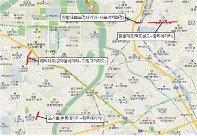 이번 공사 구간은 대덕대로 한밭대로 한밭대로 도산로 도산로 갈마로 등이다.