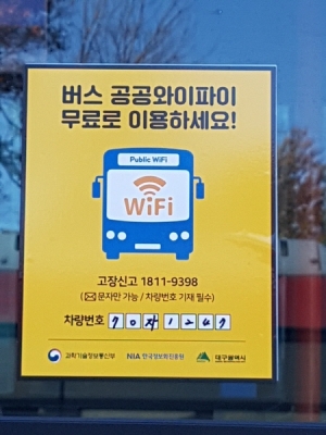 [충청뉴스큐] 대구시는 과학기술정보통신부의 국비를 지원받아 2018년 12월에 1차로 시내버스 281대에 무료 공공와이파이를 설치했고 올해는 11월까지 시내버스 302대에 추가로 설치해 점검을 완료하고 12월 1일부터 무료 와이파이 서비스를 제공한다.