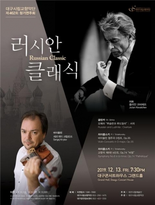 [충청뉴스큐]여행을 하지 않고도 러시아의 겨울 낭만을 만끽할 수 있는 대구시립교향악단 ‘제462회 정기연주회’가 오는 12월 13일 오후 7시 30분 대구콘서트하우스 그랜드홀에서 열린다. 올해 마지막 정기연주회이며 줄리안 코바체프 상임지휘자가 지휘한다. 이날 무대는 러시아 작곡가의 작품과 러시아 출신의 세계적인 연주자가 함께 한다. 글린카의 ‘루슬란과 루드밀라’ 서곡을 시작으로 차이콥스키의 바이올린 협주곡과 교향곡 제6번 ‘비창’을 연주하며 바이올린 협연은 세계 정상급 바이올리니스트 세르게이 크릴로프가 맡는다.