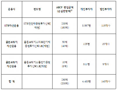 금정제십이차 ABCP는 전문투자자를 통해 증권사 및 KTB자산운용사 그리고 은행의 신탁에 판매되었고 이중 KTB 자산운용 및 골든브릿지 자산운용의 펀드에 포함되어 4,433명이 손실을 부담했다.