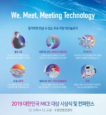 4차 산업혁명 시대가 심화되는 가운데 국내 마이스산업의 새로운 도약과 발전을 기하고 중소기업들의 육성을 위해 문체부와 공사는 이달 5일부터 6일까지 수원컨벤션센터에서 열리는 ‘2019 대한민국 마이스 대상 시상식 및 콘퍼런스’에서 미팅 테크놀로지를 참석자들에게 선보인다.