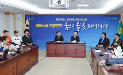 허태정 대전시장은 “베이스볼 드림파크 조성사업 건설비용에 대한 한화이글스의 투자로 새 야구장 건립이 탄력을 받게 됐다”며 “베이스볼 드림파크를 보문산 관광개발사업과 연계해 시민과 관광객들이 언제라도 찾아와 즐기고 휴식할 수 있는 명품 야구장으로 조성할 계획”이라고 밝혔다.