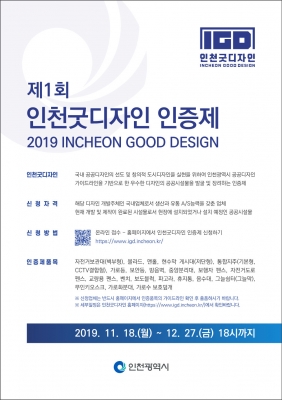[충청뉴스큐] 인천시가 우수한 디자인의 공공시설물을 발굴·보급해 공공디자인의 수준 향상 및 디자인산업 활성화를 위해 ‘제1회 인천굿디자인 인증제’를 실시한다.