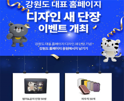 이번 개편과 함께 강원도 새 캐릭터인 범이&곰이 등을 경품으로 하는 “새 단장 응원메시지 남기기” 이벤트를 개최해 도정에 대한 관심과 참여를 높이는데 힘쓸 예정이다.