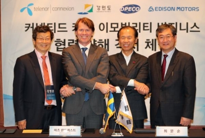 [충청뉴스큐] 강원도는 ㈜디피코, 에디슨모터스와 함께 세계 최대 모바일 네트워크 사업자 중 하나인 텔레노어 커넥션과 “강원도 전기자동차 산업의 글로벌 진출을 위한 업무협약”를 체결했다고 지난 17일 밝혔다.