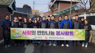 [충청뉴스큐] 강원도청 공무원노사는 23일 춘천시 근화동 소재 지역 저소득 계층 5가구에 연탄을 배달하는 봉사활동을 펼쳤다.