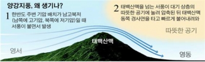 봄철 3~5월 영동지역 ‘남북고저’의 기압차로 인해 발생하는 소형 태풍급 바람이 주원인이며 양양-간성, 양양-강릉 구간에서 불어 양간지풍 또는 양강지풍이라 불리운다.