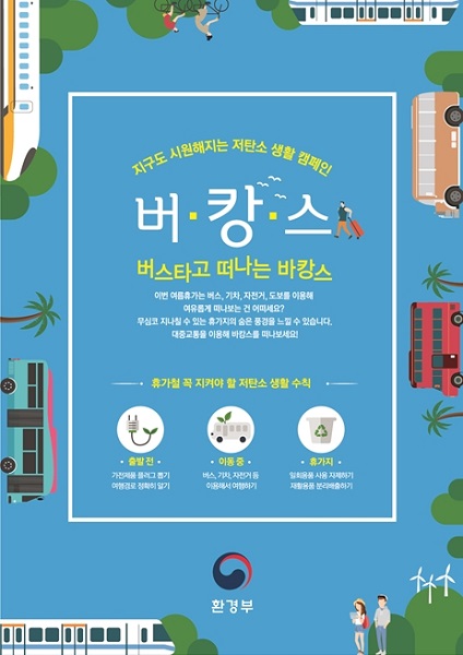 이번 캠페인은 버스, 기차 등 대중교통을 이용한 여름휴가 보내기를 주제로 하며, 휴가기간 동안 에너지를 절약하고 온실가스 감축에 도움을 줄 수 있는 저탄소 생활수칙 5가지를 제안한다.