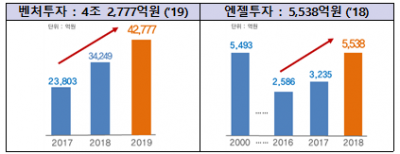2019년 벤처투자는 4조 2777억원으로 2018년 대비 25% 증가하며 역대 최초로 4조원을 훌쩍 뛰어넘었다.