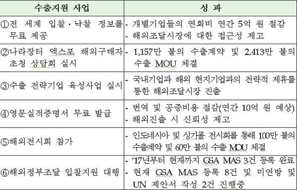 또한, 코트라와 업무협약을 체결하여 글로벌 공공조달 상담회를 공동으로 개최할 예정이며, 영문 실적증명서를 나라장터를 통해 무료로 제공하는 등 기업들의 수출지원을 위한 대내외적인 노력을 병행하고 있다.
