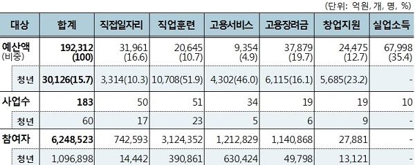이 중 직접일자리사업은 노인을 중심으로 소득보조 역할을 하고 있으며, 직업훈련과 고용서비스사업 참여자의 40% 정도가 참여 후 6개월 이내에 취업하는 것으로 나타났다.