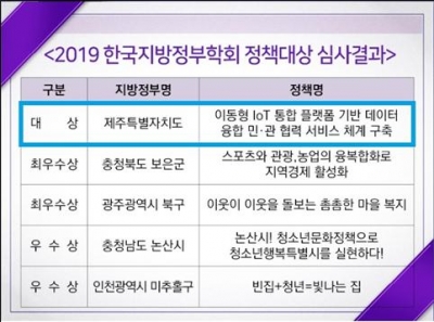 [충청뉴스큐] 제주특별자치도는 지난 14일 한국지방정부학회 주관한‘지방정부 정책대상’에서 ‘이동형 IoT 통합플랫폼 기반 데이터 융합 민·관 협업 서비스 체계 구축’ 정책사례로 ‘대상’을 수상했다고 밝혔다.