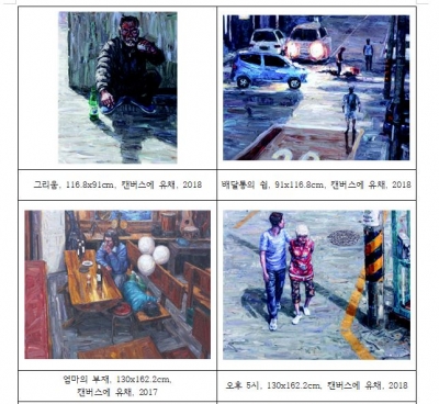 배달통의 쉼이라는 작품은 작가 주변의 삶의 풍경으로 화려하거나 예쁘지 않으며, 그저 소소하고 정직하며 때로는 무거울 뿐이다. 작가의 작업실에서 내려다보는 풍경은 너무도 느리고 가끔 멈춰 있는 듯하다. 그러다 한순간 정적을 깨는 배달통 소리와 오늘도 연세 지긋한 할머니가 쓰레기더미를 뒤지며 간다. 또한 오후 5시 작품에서는 오후 5시가 되면 치매에 걸린 늙은 어머니와 장년의 아들로 보이는 모자가 마치 칸트의 산책 시간처럼 규칙적으로 나타나는 모습을 보여준다. 그리움 작품에서는 노숙자는 아니지만, 행색이 남루한 아저씨가 등장하여 거의 매일 슈퍼 앞에서 막걸리를 한 잔씩 하며 그 거리를 바라본다.