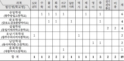이번 2019학년도 사립 중등교사 임용후보자 선정경쟁시험 공동전형 선발예정 과목과 인원은 도덕·윤리 1명, 수학 1명, 물리 2명, 화학 2명, 지구과학 2명, 일반사회 1명, 역사 1명, 영어 1명, 음악 3명, 체육 1명, 전기·전자·통신 2명, 미용 2명으로 12개 과목 19명이다. 숭일학원, 죽호학원, 설월학원, 호남기독학원, 낭암학원, 홍복학원 등 6개 법인이 참여하고 있다.