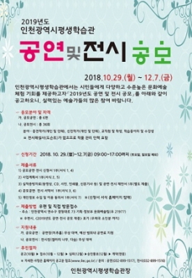 [충청뉴스큐] 인천광역시평생학습관에서는 2019년 공연 및 전시 공모를 통해 1년동안 미추홀 공연장과 갤러리 "나무","다솜"을 빛낼 예술가들을 찾는다.